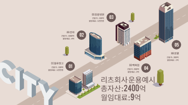 리츠회사란 투자자의 자금으로 부동산을 임대, 운영하고 판매 수익을 얻기도 하며 자산을 운용하는 회사입니다.