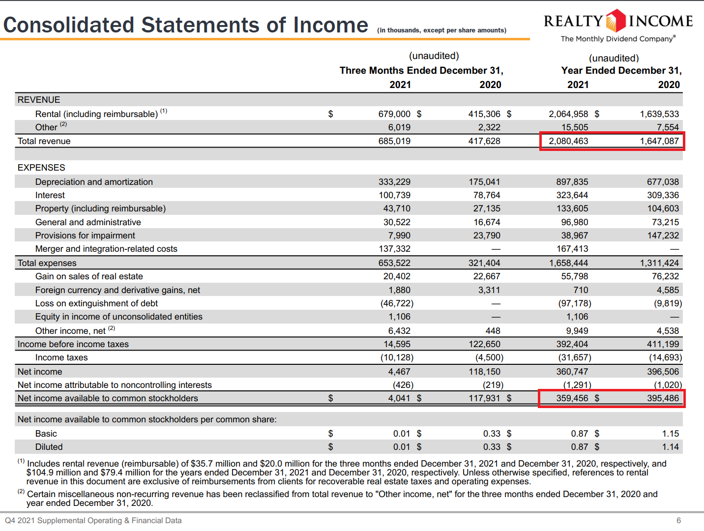 그러나 리얼티인컴의 매출액은 2020년 1,647 백만 달러에서 2,080 백만 달러로