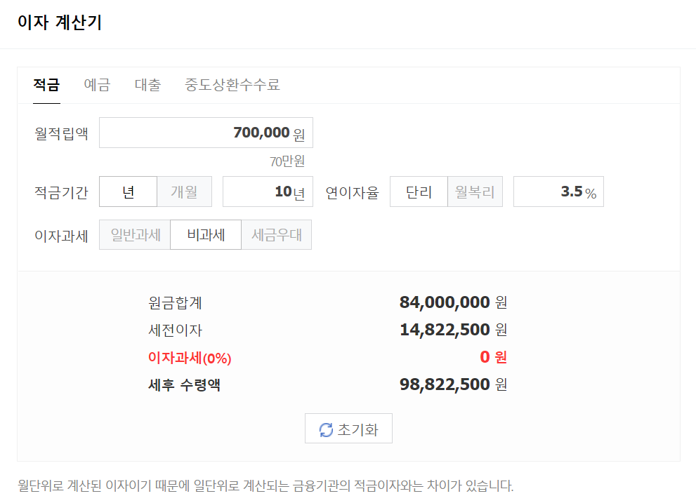 70만원씩 10년동안 1억의 목돈을 마련하는 적금의 금리는 얼마일까요? 적금계산기를 통해 계산해보면 예상되는 금리는 약 3.5%입니다. 추후 지원정책이 확정되어봐야 알겠지만, 청년도약계좌의 금리는 3.5% 정도일것으로 예상됩니다.