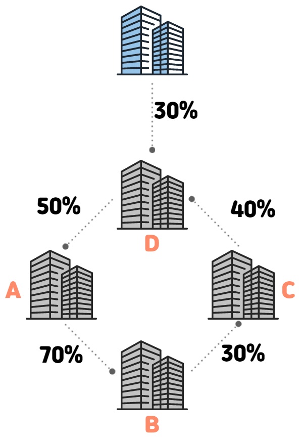 과거 국내 기업들은 위의 그림과 같은 순환출자 구조로 운영되어 왔습니다. 순환출자구조는 적은 지분으로 계열사를 통제하는 것이 큰 특징입니다. 모회사의 지분만 가지고 있다면, 낮은 계열사 주식만으로도(ex: D기업의 30%)만으로도 모든 계열사를 전부 통제할 수 있게 되는 것이죠. 더군다나 각 회사가 서로의 주식을 보유하고 있다면 더 낮은 지분으로도 경영이 가능했죠.